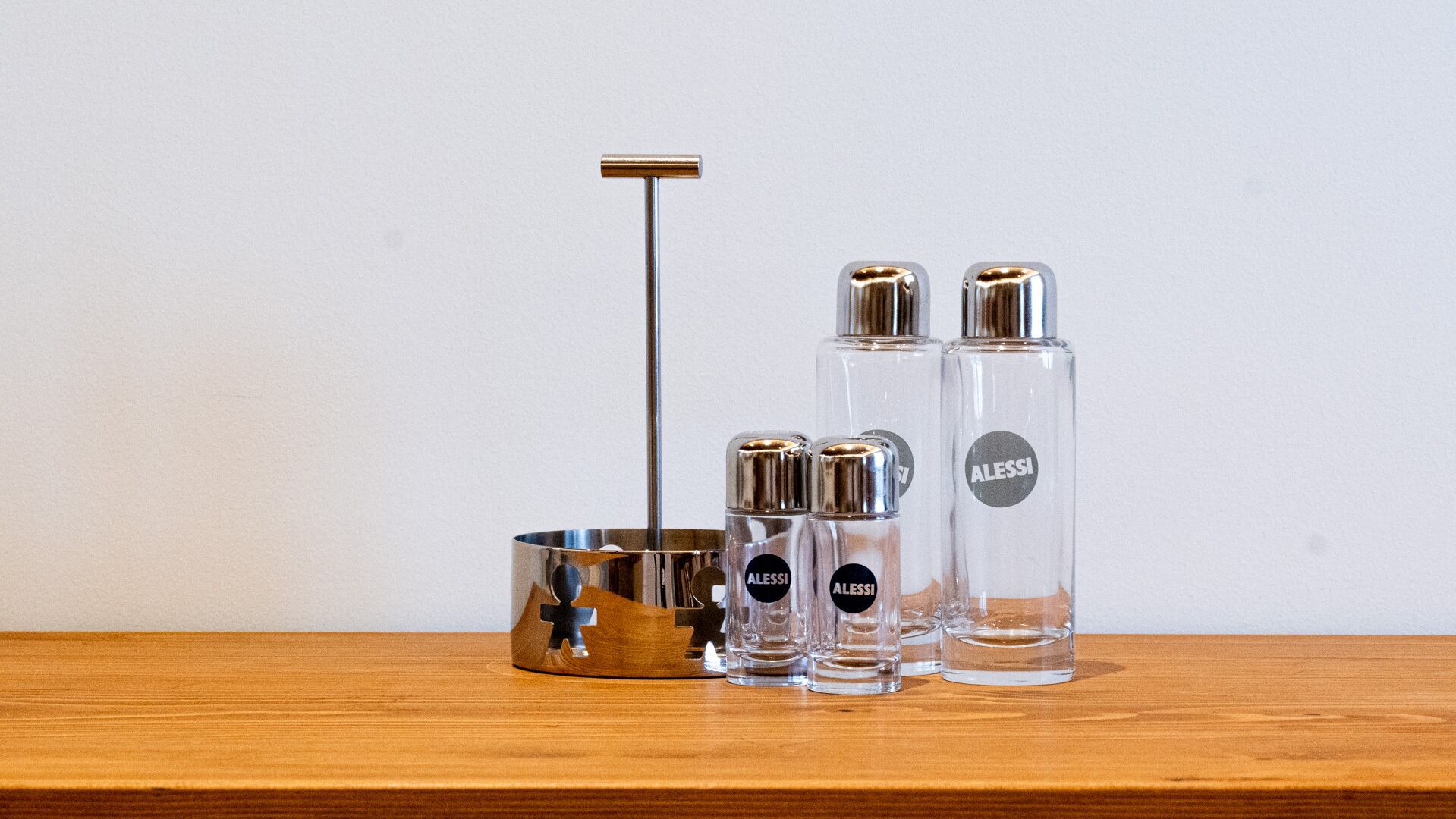 ALESSIの調味料セット。ALESSI好きなら一目でわかる、人型にくりぬかれたセットのサーバーと、重量感のある調味料ボトル。